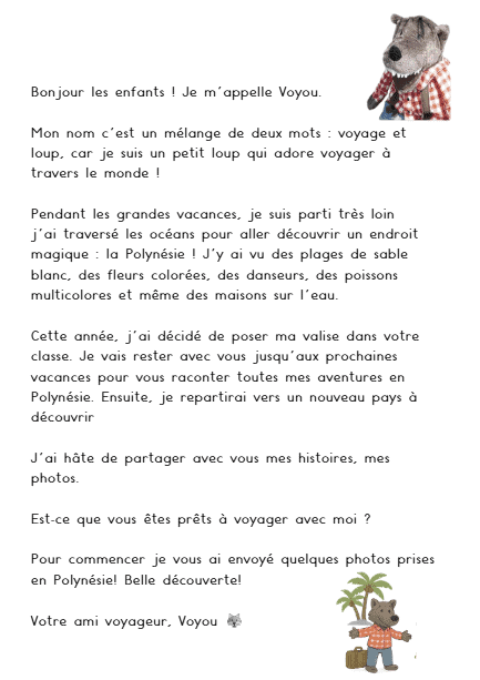 Nous avons lors de la première semaine fait la connaissance de Voyou, c’est un petit loup voyageur qui a posé ses valises dans notre classe pour l’année. Cet été il était en POLYNÉSIE, il va alors nous faire découvrir cet endroit du monde pendant la première période! Il nous a même écrit une lettre pour nous raconter cela.