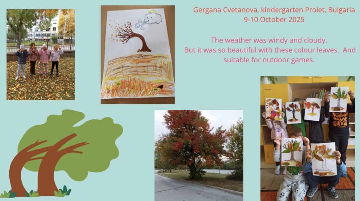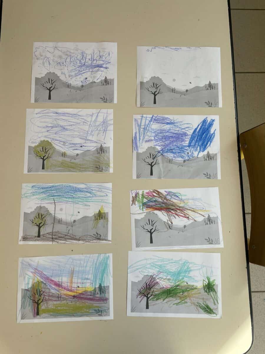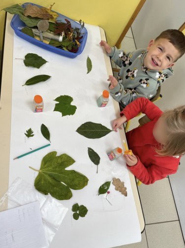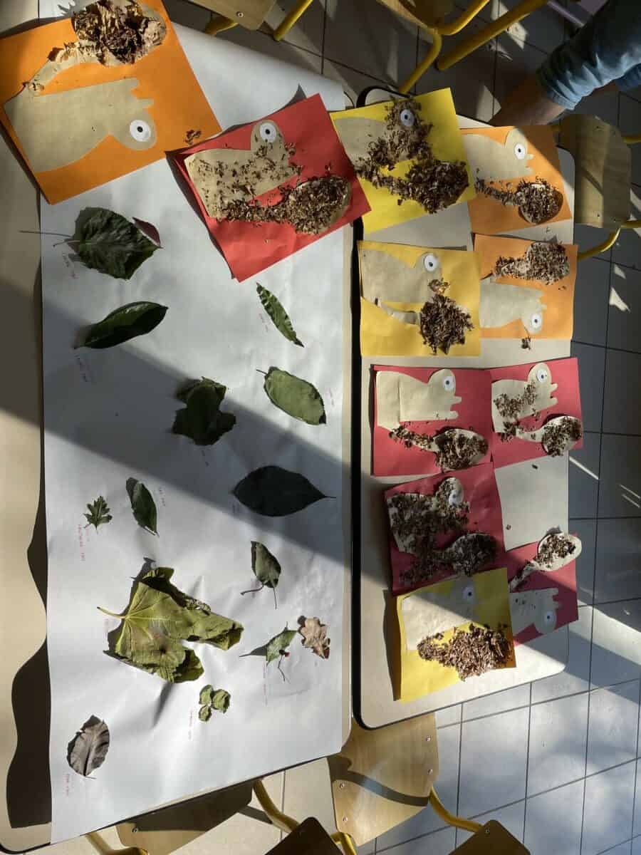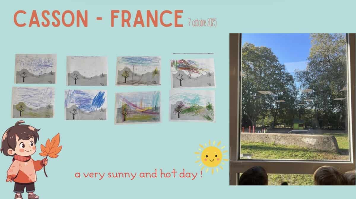 Pour le mois d’octobre, les élèves ont exploré le thème de l’automne : ils ont observé comment cette saison se manifeste en France — à travers la météo, les vêtements ou encore les feuilles. Chaque jour, ils ont regardé la météo pour la représenter sur un coloriage, ramassé des feuilles pour créer un herbier, et réalisé un bricolage aux couleurs de l’automne.